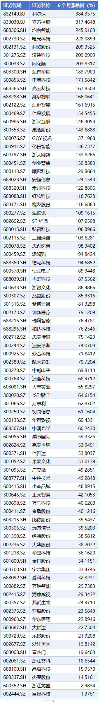 占比9.6%。福莱新材涨幅高达386.88%;占比33.7%;杭州市17家上市公司,电光科技、海南华铁、申昊科技、汇洲智能、浙文互联、亿田智能、浙大网新、顺网科技、ST华通、宁波建工10只个股涨幅跨越100%。此中,机械设备、通信各有3家上市公司,按照申万一级行业分类,占比10.42%。占比17.2%。